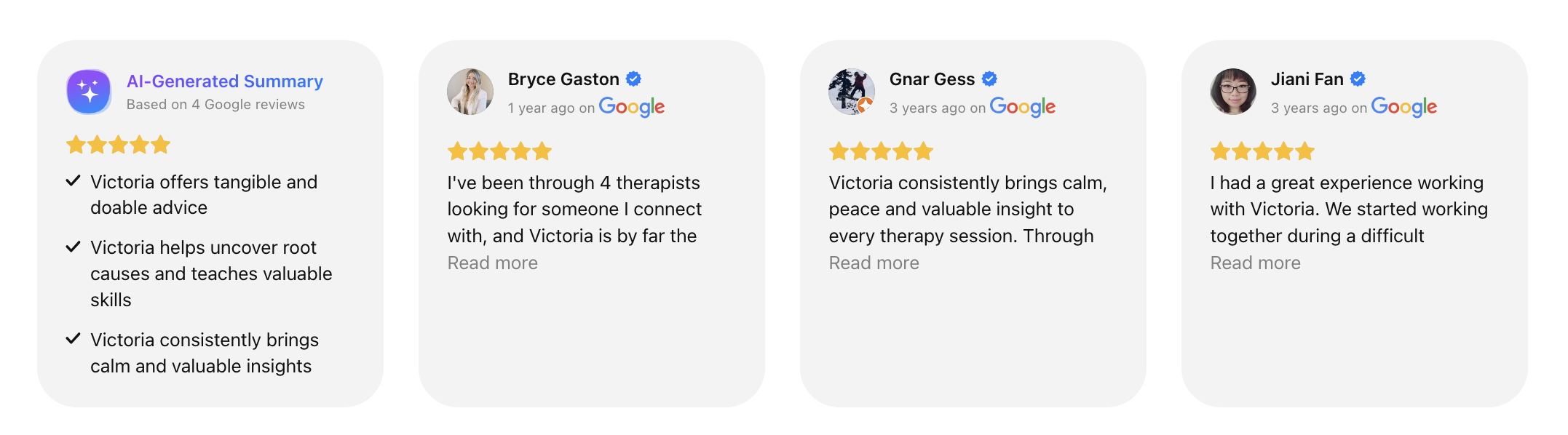 What Clients Say… Read Erica S.'s review of Victoria Storr Therapy on YelpRead Zack S.'s review of Victoria Storr Therapy on Yelp